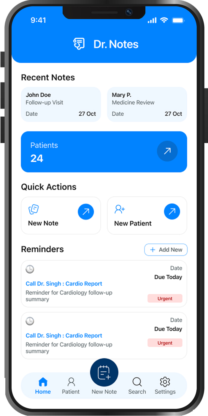 Dr. Notes is a secure, offline app for doctors to record and manage patient notes. All data stays on the device, with easy access to past visits and reminders — saving time and keeping workflow organized.