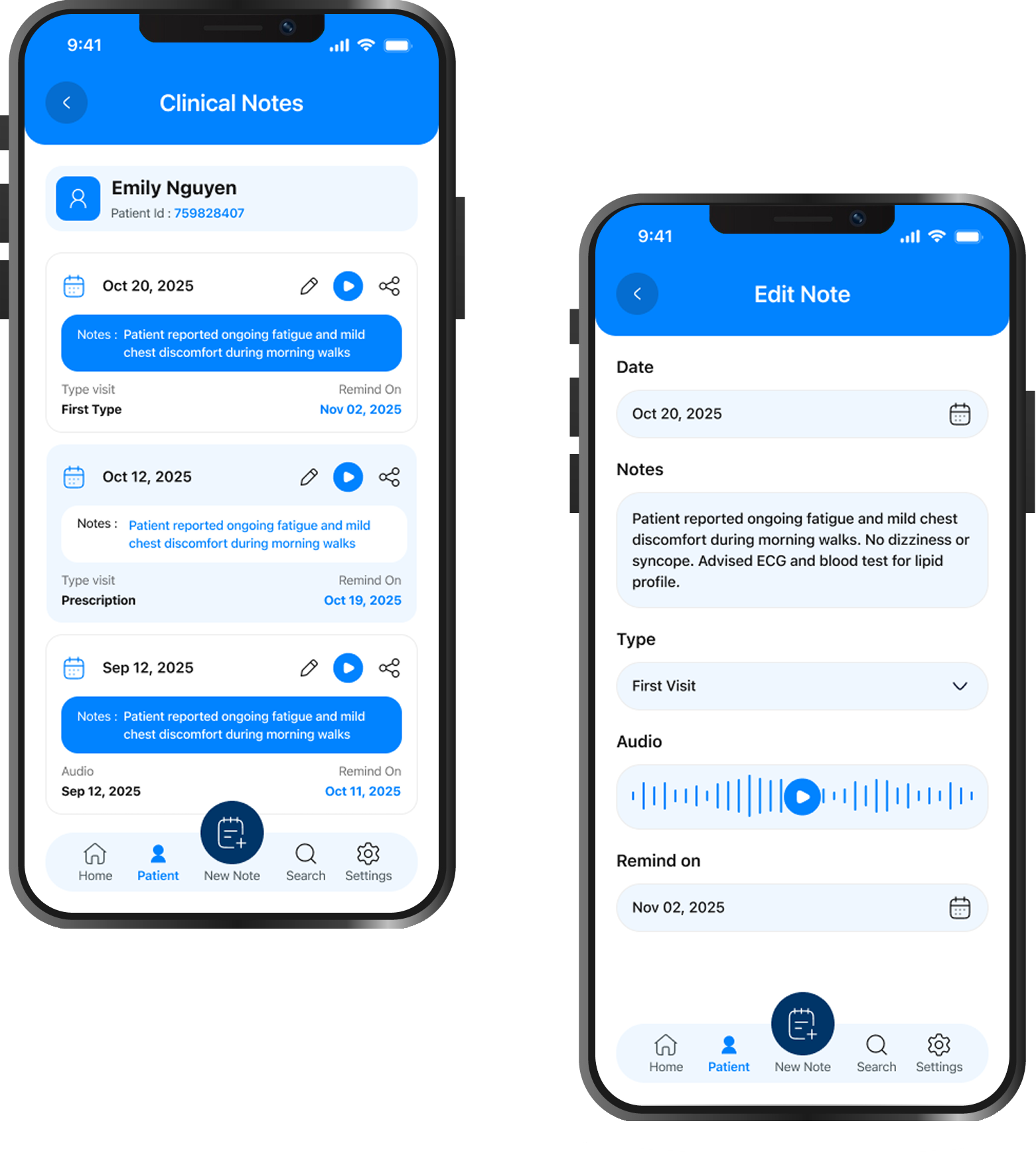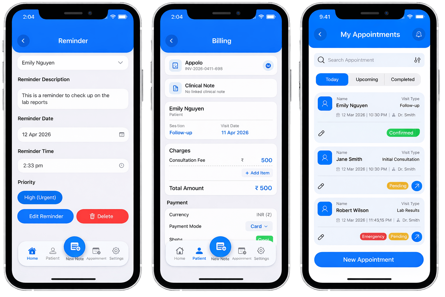 Doctors can set reminders, review past visits, and track treatment progress effortlessly.